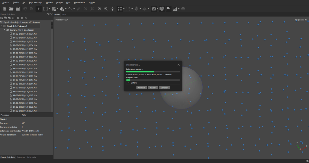 - Cuando se selecciona «Ok», un cuadro de diálogo aparecerá con una barra que muestra el progreso de la orientación de fotografías en el proyecto.
