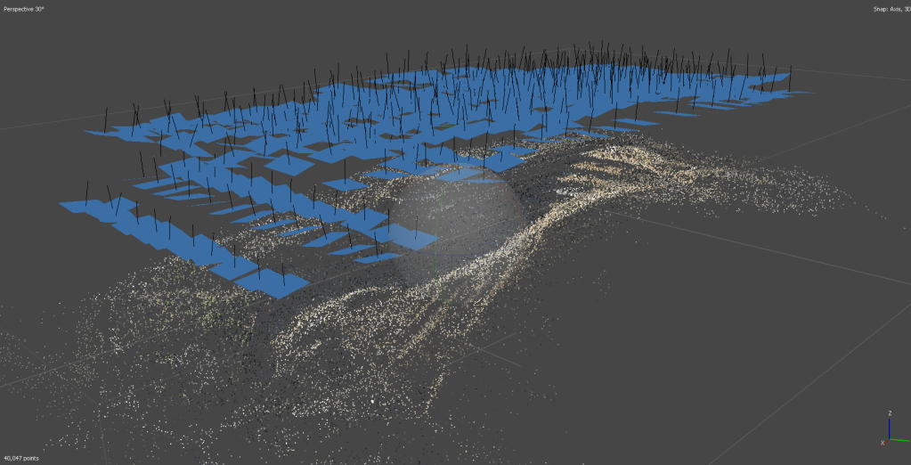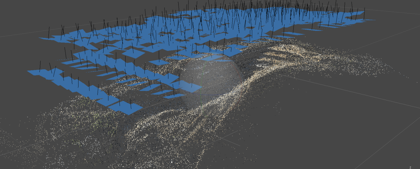 Una vez concluido el proceso de alineación, se mostrará en pantalla una nube de puntos dispersa, conocida también como puntos de paso, y la ubicación de cada una de las fotografías.